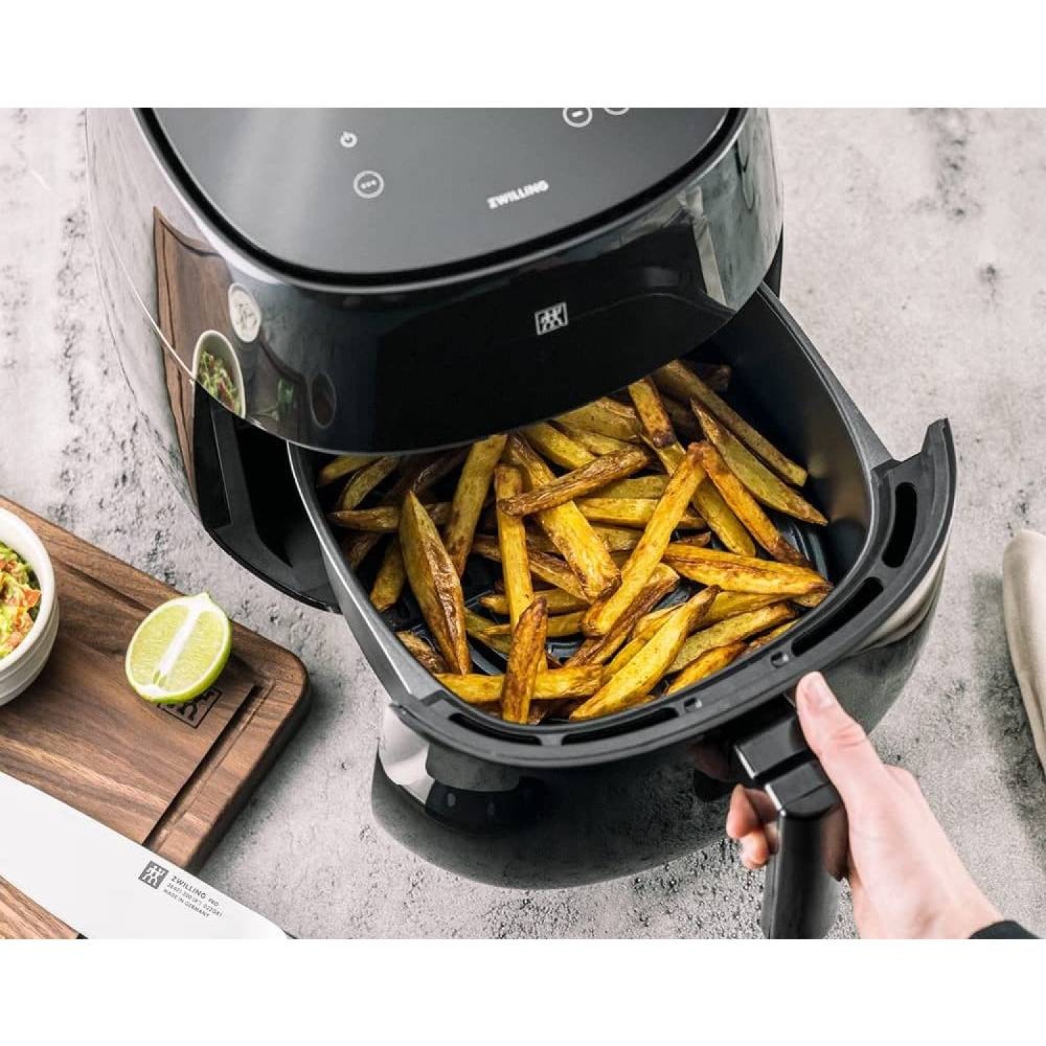 Είναι η επαναστατική Zwilling J.A.Henckels Φριτέζα αέρος Air Fryer σειρά Enfinigy που τηγανίζει χωρίς λάδι! Και όχι μόνο! Με μία μόνο συσκευή μαγειρέψτε, ψήστε, τηγανίστε από πατάτες, κοτόπουλο ή ψάρι μέχρι pizza και κέικ. Ο καινοτόμος τρόπος λειτουργίας της, με την ταχεία κυκλοφορία ζεστού αέρα, σας χαρίζει ελαφρύ φαγητό με ελάχιστο ή καθόλου λάδι. Όσο ετοιμάζεται το φαγητό σας δεν «πιτσιλάει» κι εσείς απαλλάσσεστε από το χρονοβόρο καθάρισμα μετά το μαγείρεμα. Η εύχρηστη οθόνη αφής LED κάνει την όλη διαδικασία πανεύκολη. Η μεγάλη της χωρητικότητα σας επιτρέπει να μαγειρέψετε μεγάλες ποσότητες. Φυλάξτε φαγητό για την επόμενη μέρα ή προσκαλέσετε για δείπνο την παρέα σας! Αποκτήστε την κι εσείς και μαγειρέψτε εύκολα και γρήγορα! Υγιεινά και νόστιμα!